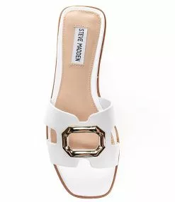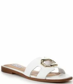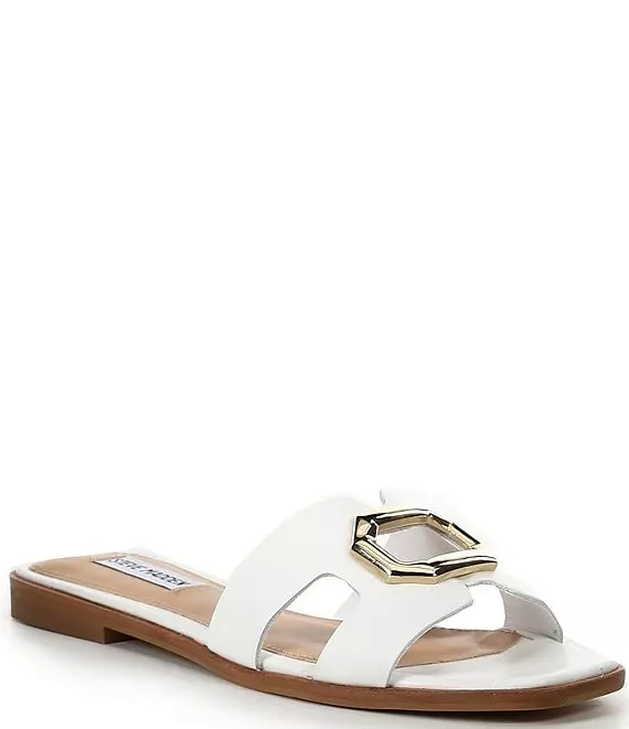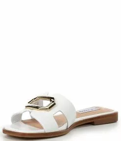 From Steve Madden, the Harlene Leather Gold Ornament Flat Slide Sandals feature: