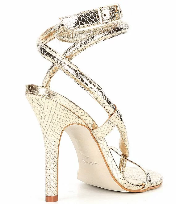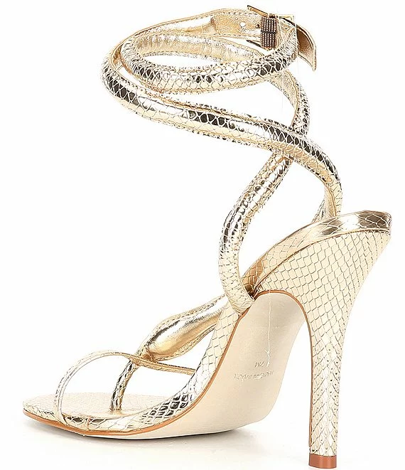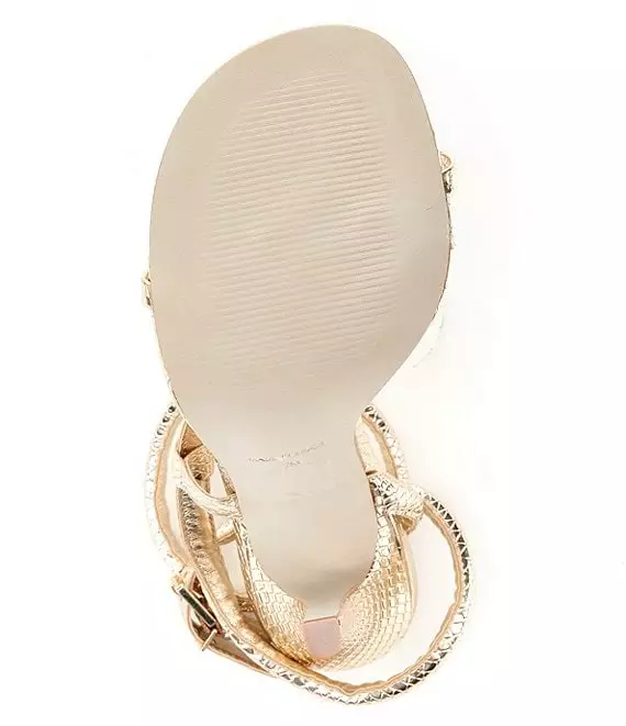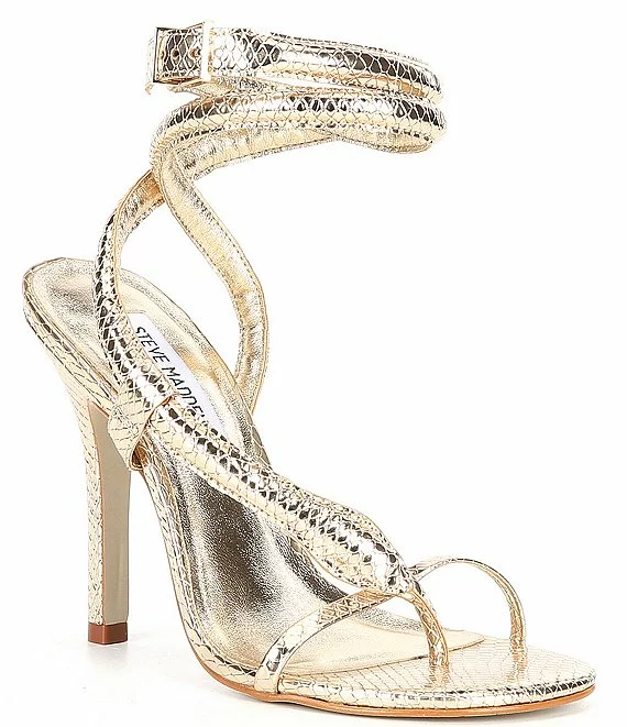 From Steve Madden, the Scalia Metallic Snake Detail Ankle Wrap Thong Dress Sandals feature:
